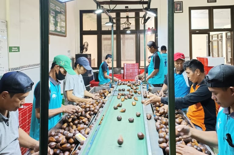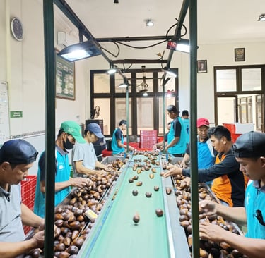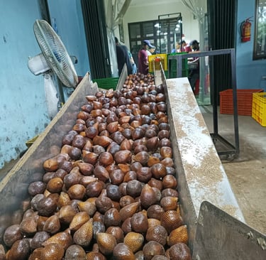 Once harvested, the fruits are transported to PT Salinov Bintang Mulia’s central facility. Upon arrival, they undergo a thorough inspection for quality, appearance, and defects. This first check ensures only export-grade fruits continue the process, while non-standard fruits are separated. This guarantees that buyers receive only the finest selection